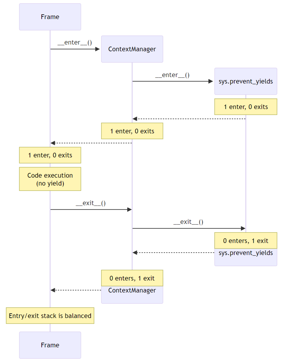 Der neue Kontextmanager sys.prevent_yields erfordert Unterstützung des Interpreters. Für jeden Frame verfolgen wir die Ein- und Ausgänge dieses Kontextmanagers.