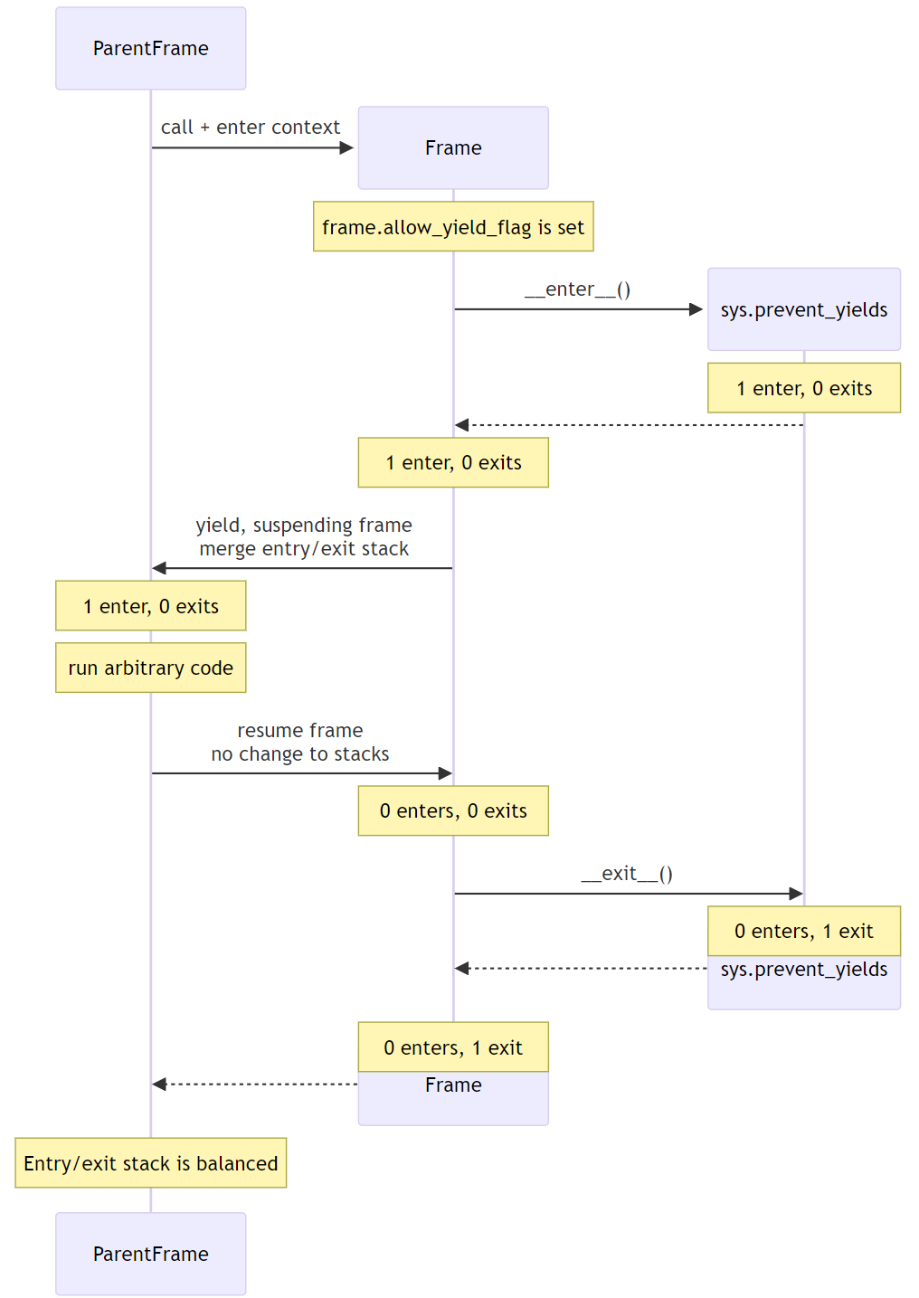 Dies stellt sicher, dass der Elternframe korrekt jeglichen verbleibenden sys.prevent_yields-Zustand erbt, während der Frame sicher ausgesetzt und wieder aufgenommen werden kann.