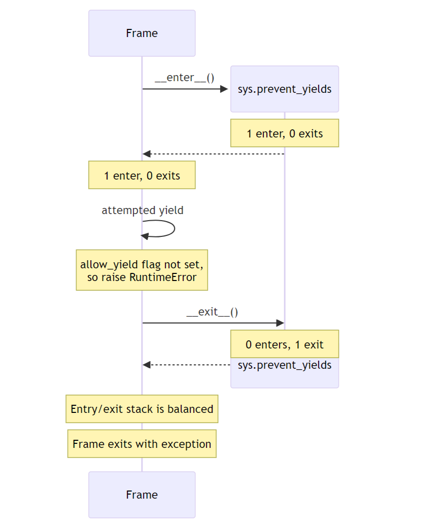 In diesem Beispiel versucht der Frame, innerhalb des sys.prevent_yields-Kontexts zu yielden. Dies wird vom Interpreter erkannt, der eine RuntimeError auslöst, anstatt den Frame auszusetzen.